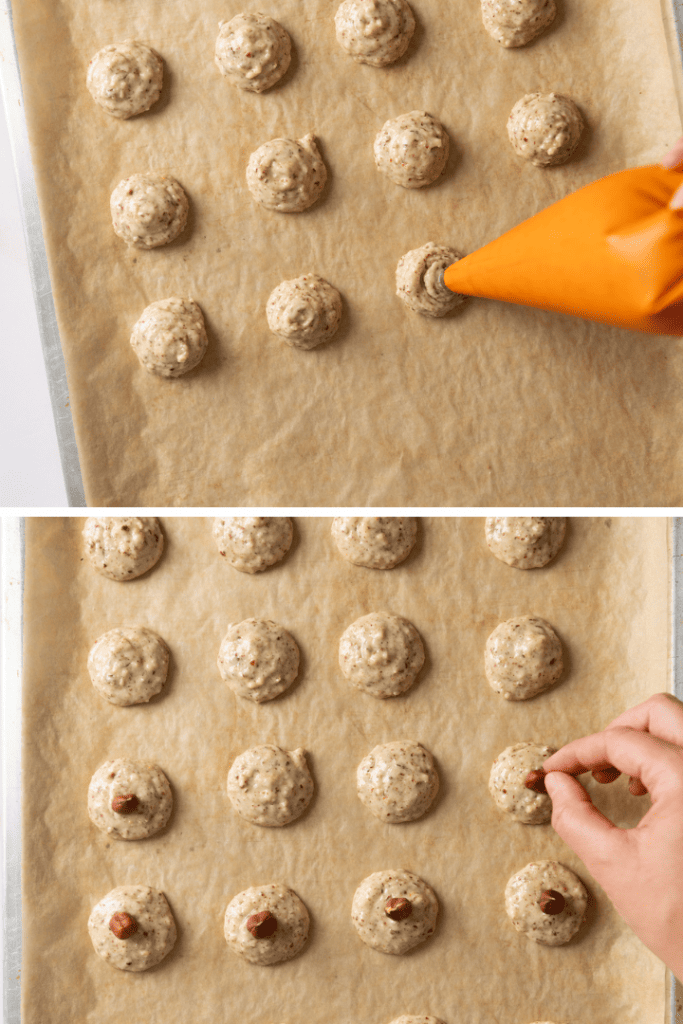 Fülle den Teig in einen Spritzbeutel mit großer Lochtülle und spritze kleine Portionen auf das Backblech. Lege eine Haselnuss auf jedes Plätzchen und backe sie im vorgeheizten Backofen ca. 10 Minuten, bis sie goldbraun werden und sich gut vom Blech lösen lassen.