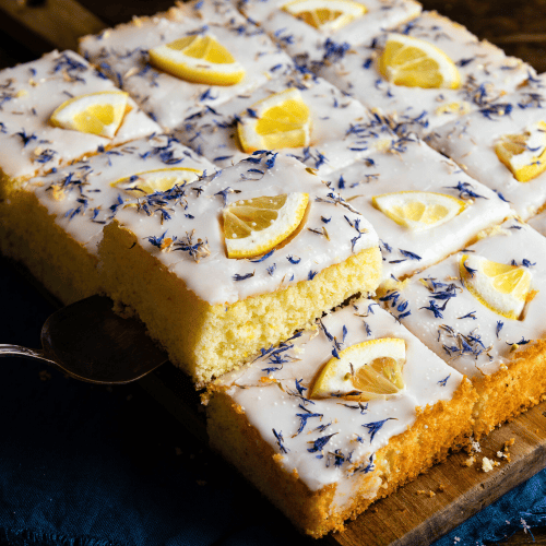 Zitronenkuchen nun mit Zitronenscheiben, Zuckerstreuseln und getrockneten Blüten garnieren, vom Blech lösen und in handliche Stücke schneiden. Bis zum Servieren unter eine Kuchenglocke lagern.
