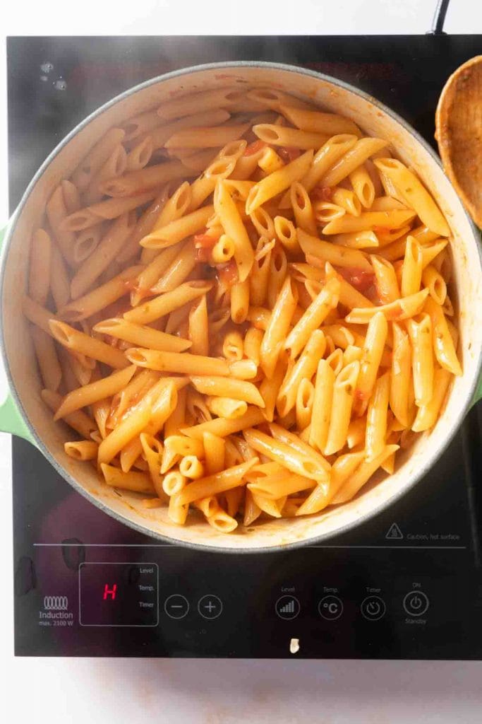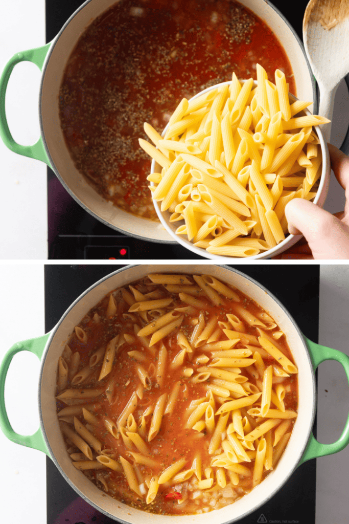 Nudeln, Oregano und Wasser mit in den Topf geben. Mit reichlich Salz abschmecken. Deckel auf den Topf geben und so lange kochen, wie Kochzeit auf der Nudelpackung angibt.