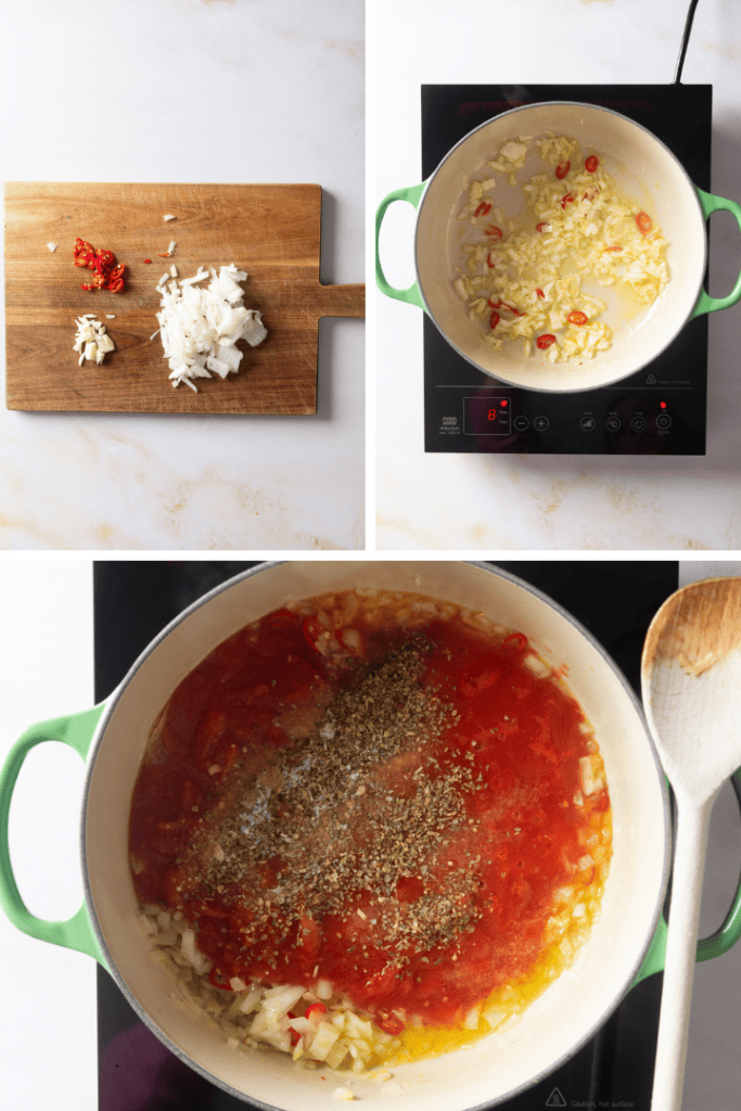 Zwiebel, Knoblauch schälen und fein hacken. Chilischote ebenfalls fein hacken. In einen Topf etwa 1 EL Olivenöl erhitzen. Zwiebel, Knoblauch und Chili darin kurz anschwitzen. Die passierten Tomaten dazu geben. Kurz umrühren.