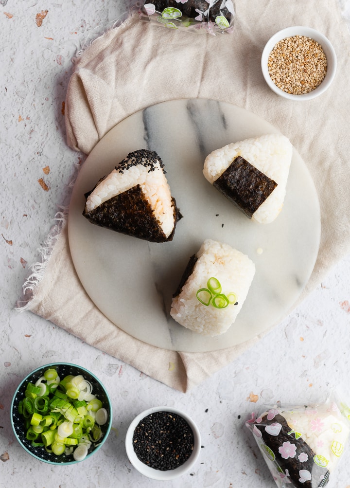 Onigiri eignen sich hervorragend zum Vorbereiten. In Japan gibt es die kleinen Reis-Snacks mit den unterschiedlichsten Füllungen an jeder Ecke zu kaufen. Sie halten in etwas Frischhaltefolie eingewickelt, ohne weiteres 1-2 Tage im Kühlschrank.Alternative Füllungen: