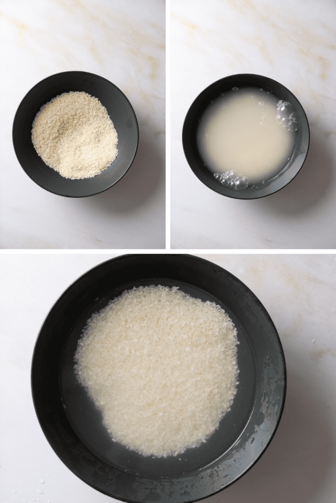 Wasche den Reis gründlich, bis das Wasser klar ist. Du kannst das unter fließendem Wasser machen oder das Wasser austauschen, sobald es trüb ist. 3-4 Waschgänge sind in der Regel nötig.