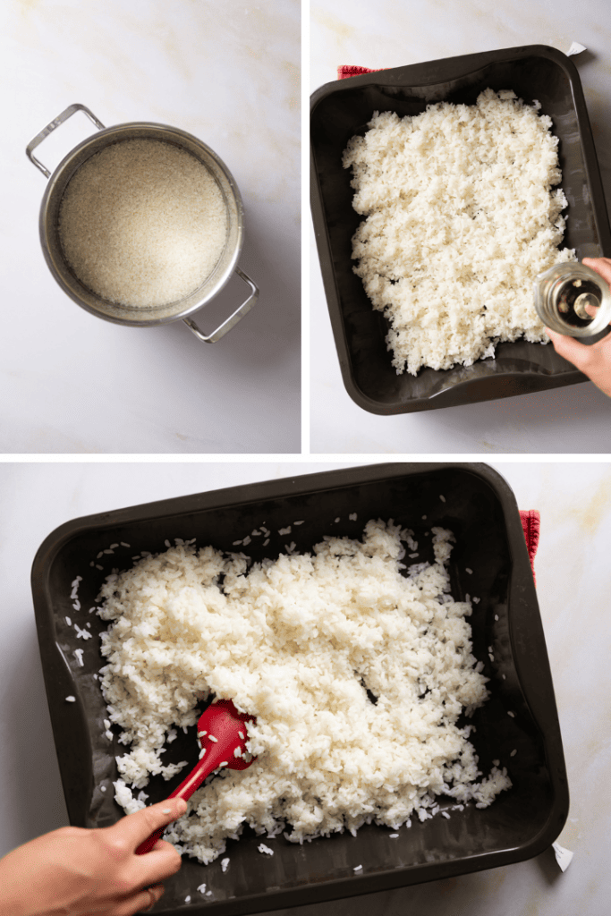 Koche den Reis mit Wasser nach Packungsangabe (in der Regel etwa 20 Minuten). Gib den Reis nach dem Kochen in eine flache Form und gib Salz und Mirin dazu. Vermenge alles gründlich und lass den Reis abkühlen.