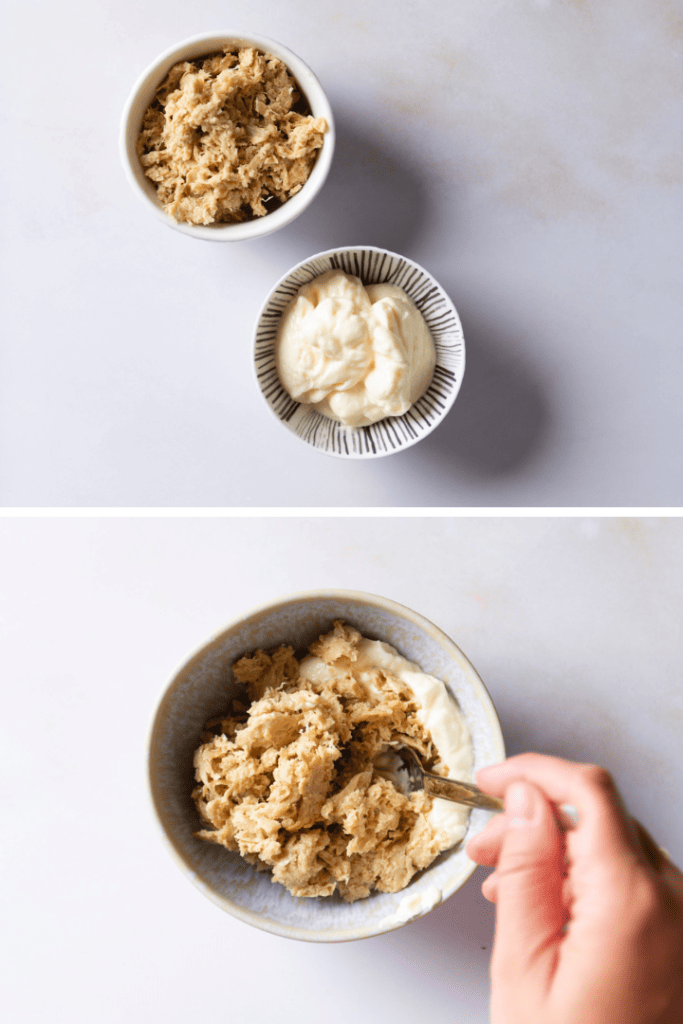 Vermenge Thunfisch und Mayonnaise. Schmecke die Mischung ggf. mit etwas Sojasauce ab.