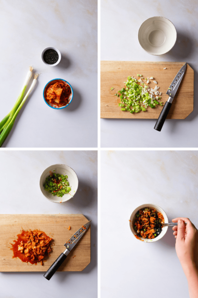 Hacke Kimchi und Frühlingszwiebeln fein und vermenge sie mit dem schwarzen Sesam.