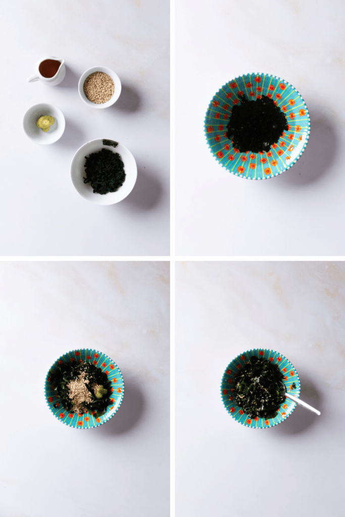 Weiche die Wakame Algen für etwa 10 Minuten in kaltem Wasser ein und drücke sie anschließend gründlich aus.Vermenge die eingeweichten Algen mit Wasabi und Sesam.