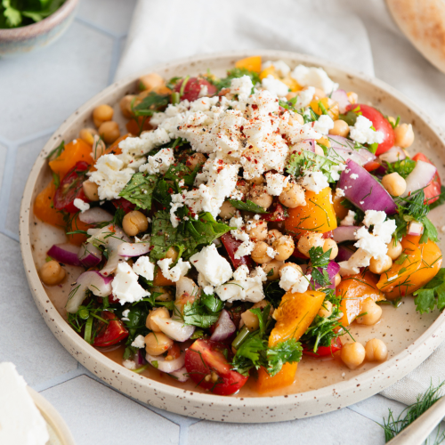Serviere den orientalischen Kichererbsen Salat mit zerkrümeltem Fetakäse.