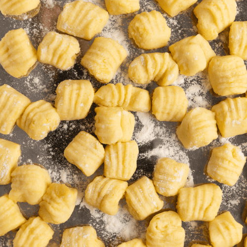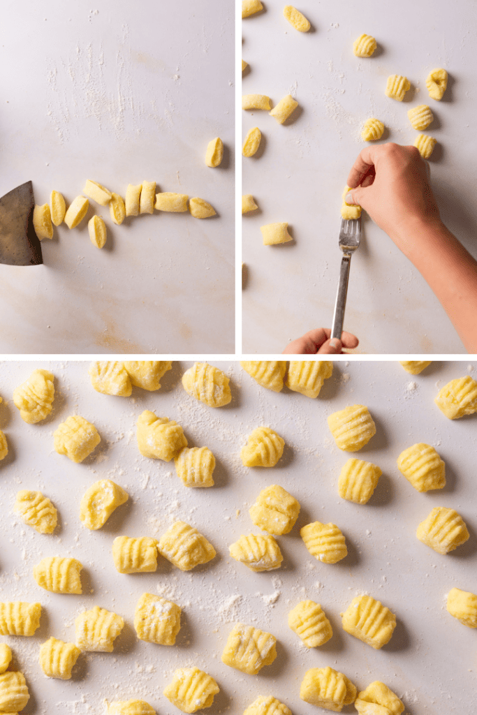 Teile den Teig in viertel und forme jedes Viertel zu einem etwa 2 cm dicken Teigstrang. Unterteile jeden Teigstrang in ca. 1,5 cm große Teigportionen. Rolle jede Teigportionen mit dem Daumen über den Rücke einer Gabel. So entsteht das typische Gnocchi Muster und Form. Verwende gerne etwas Mehl, damit der Teig nicht klebt.