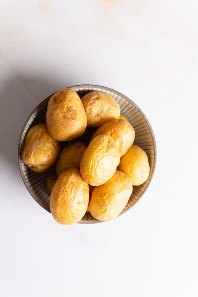 Backe die Kartoffeln mit Schale im Backofen, bis sie weich sind. Alternativ kannst du die Kartoffeln auch mit Schale kochen.