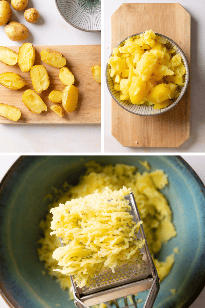 Schäle die garen Kartoffeln und drücke das Fruchtfleisch durch eine Kartoffelpresse. Alternativ kannst du die Kartoffeln auch fein reiben.