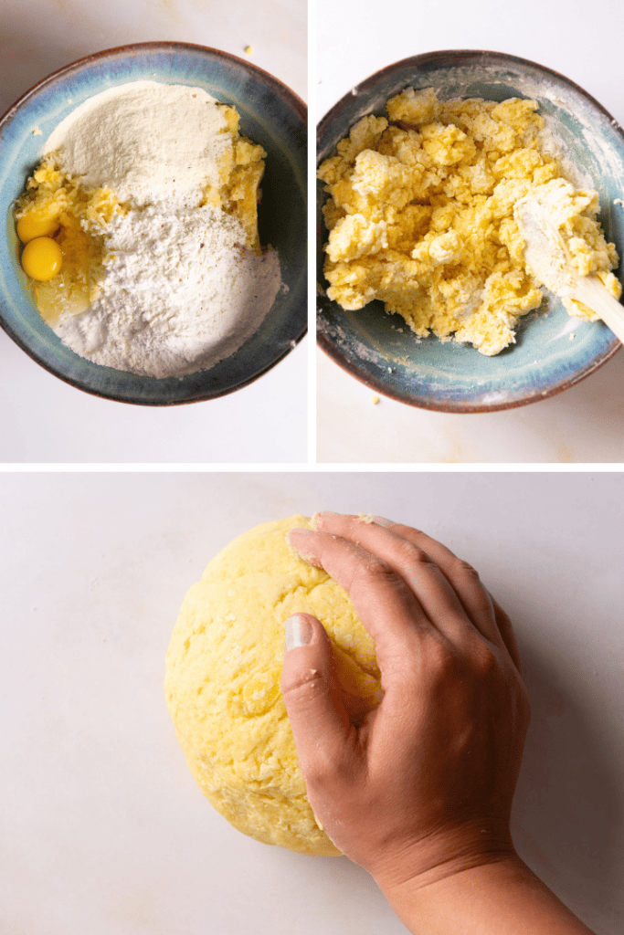 Vermenge die Kartoffeln mit den restlichen Zutaten. Zunächst geht das gut mit einem Holzlöffeln wenn sich ein krümeliger Teig gebildet hat kippst du den Teig auf die Arbeitsplatte und knetest ihn für ein paar Minuten zu einem glatten Teig.