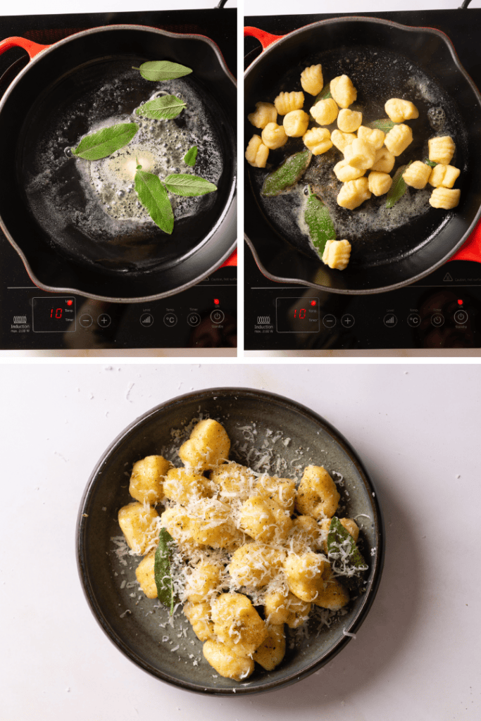 Für den Klassiker, Gnocchi mit Salbeibutter erhitzt du eine Pfanne und schmilzt die Butter darin. Gib die Salbeiblätter hinein und warte, bis die Butter auf den Blättern schäumt. Gib dann die Gnocchi hinzu und brate sie goldbraun an.Serviere die Gnocchi in Salbeibutter mit etwas Salz, Pfeffer und frisch geriebenem Parmesan.