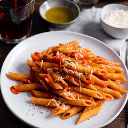 Penne Arrabiata direkt mit fein geschnittenen Chilistreifen und Pecorino Romano servieren.