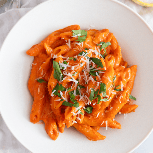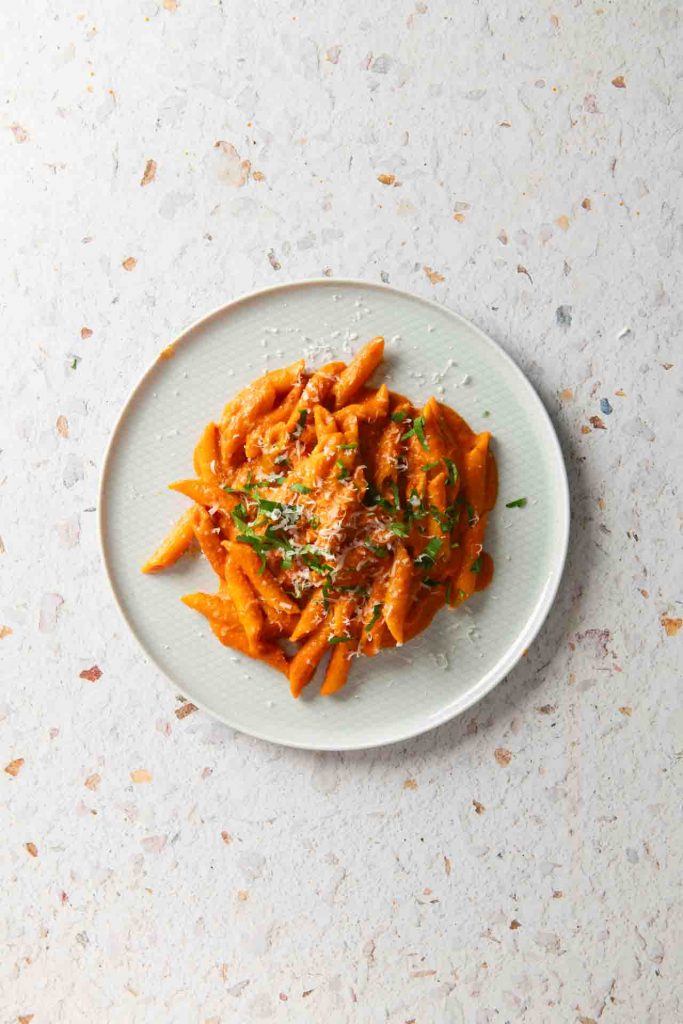 Serviere die Penne alla Vodka dann mit frisch geriebenem Parmesan und gehackter Petersilie.