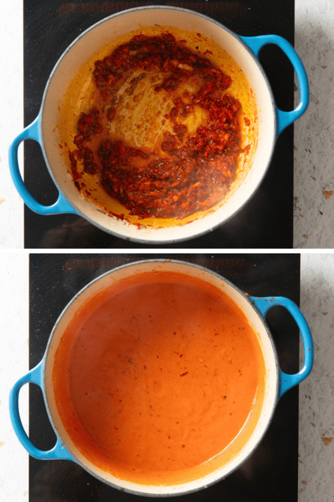 Füge Chiliflocken, Oregano und Tomatenmark hinzu und brate alles nochmal kräftig an. Lösche dann mit Wodka ab und lass ihn kurz aufkochen. Füge dann die passierten Tomaten hinzu und die Schlagsahne. Schmecke die Soße mit Salz und Pfeffer ab.