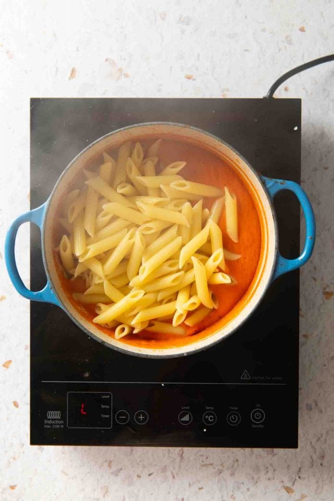 Koche die Penne nach Packungsangabe bis sie al dente sind und gib sie dann zur Soße. Fange etwas Pastawasser auf und verdünne die Soße nach Bedarf.