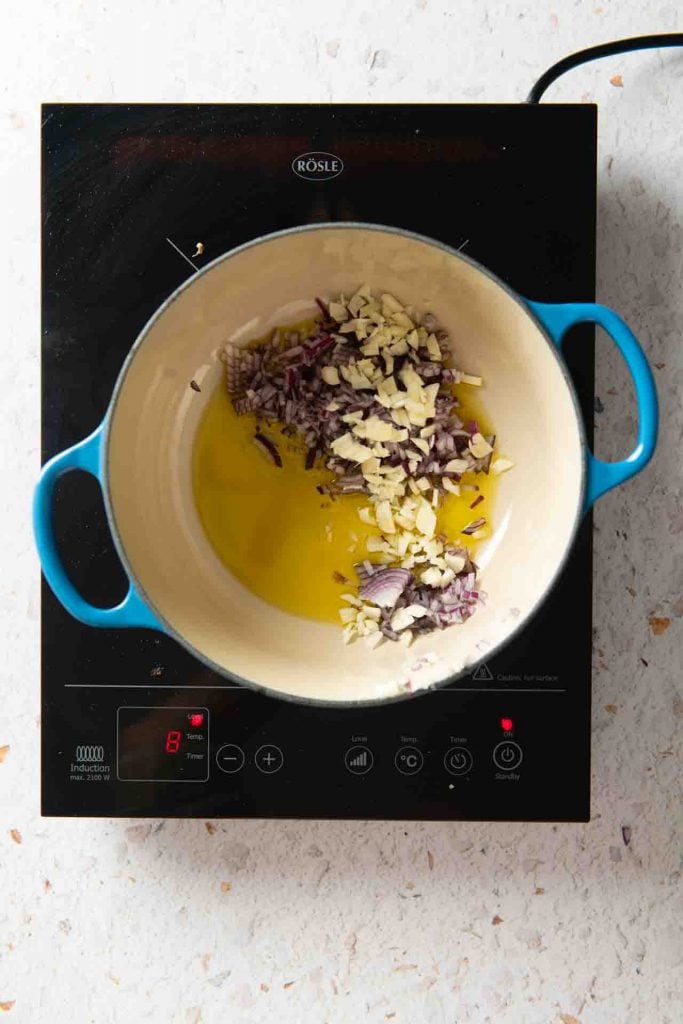 Bringe in einem großen Topf mindestens 2,5 Liter Wasser zum Kochen. Hacke derweil Zwiebeln und Knoblauch sehr fein und dünste sie im Olivenöl an, bis sie glasig sind.