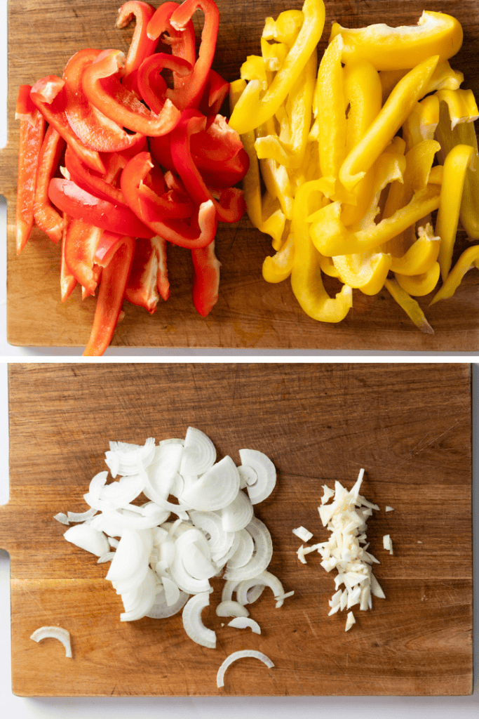 Wasche die Paprika und befreie sie vom Kerngehäuse. Schneide sie dann in grobe Streifen. Schneide die Zwiebel in feine Halbringe und hacke die Knoblauchzehe fein.