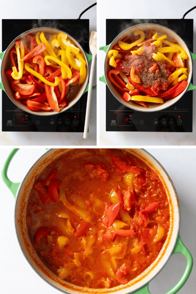 Braten zunächste Zwiebeln und Knoblauch im Olivenöl an bis sie glasig werden und gib dann die Paprikastreifen dazu. Brate sie 1-2 Minuten mit an, bevor du sie Dosentomaten mit in den Topf gibst. Würze mit Salz und lass die Peperonata für ca. 30-45 Minuten bei geschlossenem Deckel schmoren bis die Paprika zart ist.