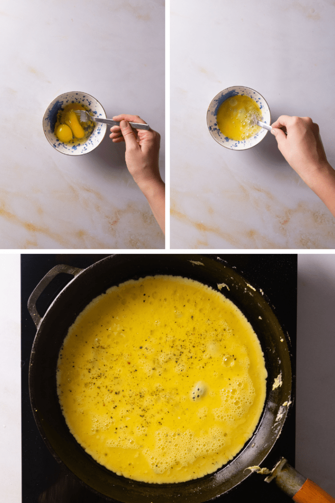 Butter in einer Pfanne bei mittlerer Hitze erwärmen. Eier in eine Schüssel geben und mit einer Gabel kräftig aufschlagen. Die aufgeschlagenen Eier direkt in die vorbereitete Pfanne geben. In der Pfanne salzen und pfeffern.