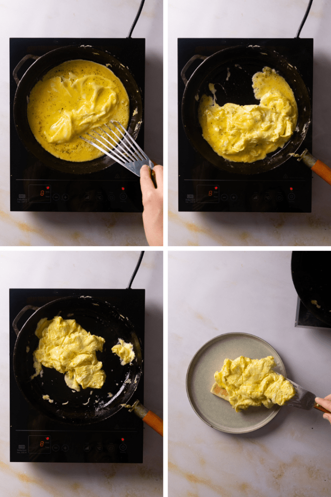 Mit einem Holz- oder Silikonspatel vorsichtig vom Rand zur Mitte hin am Boden der Pfanne entlang das gestockte Rührei zur Mitte hin schieben. Nicht zu viel rühren, sondern das Ei nur durch die Pfanne “schieben”. Das Rührei ist fertig, wenn größtenteils fest ist, aber noch glänzende Stellen zu sehen sind. Rührei direkt pur oder auf gebutterten Toast servieren.