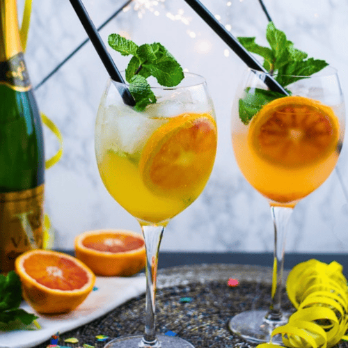 Glas mit Eis auffüllen. Die Orangenscheibe an die Wand des Glases drücken. Mit Prosecco und Tonic Water auffüllen. Mit Minze dekorieren.