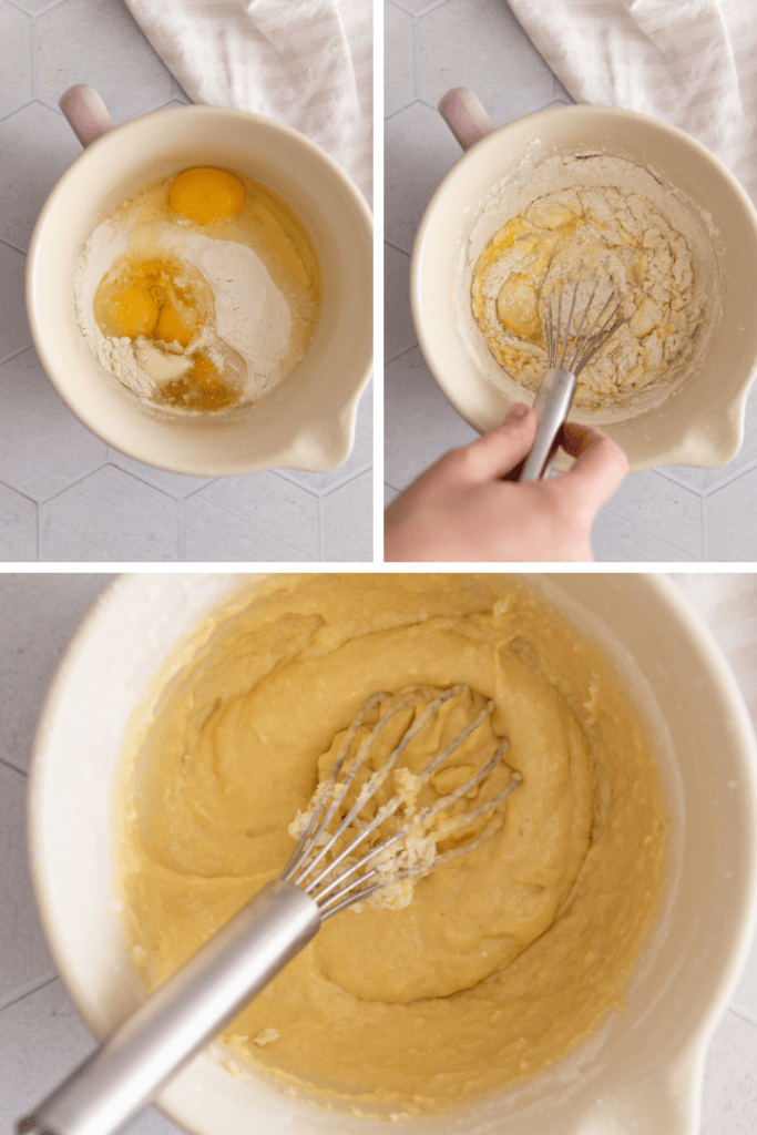 Die Paste anrühren: Gib 150 g Weizenmehl, 3 Eier und 1 Prise Salz in eine Rührschüssel. Verrühre diese drei Zutaten zunächst (mit einem Schneebesen oder Handrührgerät) zu einem dicken, glatten Brei. Das ist wichtig, um später Klümpchen zu vermeiden!
