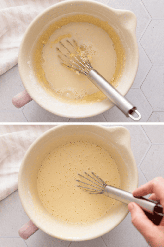 Milch zugeben: Rühre nun nach und nach 250-300 ml Milch unter, bis der Pfannkuchenteig die gewünschte, flüssige Konsistenz erreicht hat. (Je flüssiger der Teig, desto dünner werden später die Pfannkuchen).
