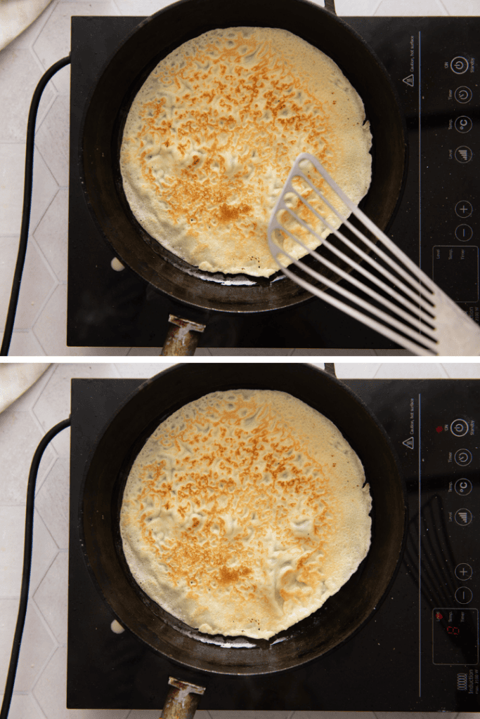Backen & Wenden: Lass den Pfannkuchen nun so lange braten, bis die Oberseite trocken und matt aussieht. Wende ihn dann vorsichtig mit einem flachen Pfannenwender und lass ihn auch auf der anderen Seite noch einmal ca. 1 Minute goldbraun garen.