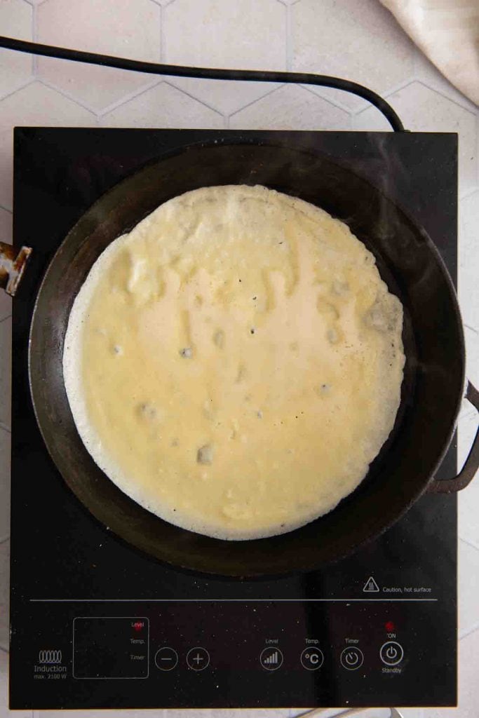 Teig verteilen: Wenn das Öl warm ist, gibst du mit einer Schöpfkelle einen Schluck Teig in die Mitte der Pfanne. Hebe die Pfanne sofort an und schwenke sie aus dem Handgelenk, sodass sich der Teig gleichmäßig auf dem Boden verteilt.