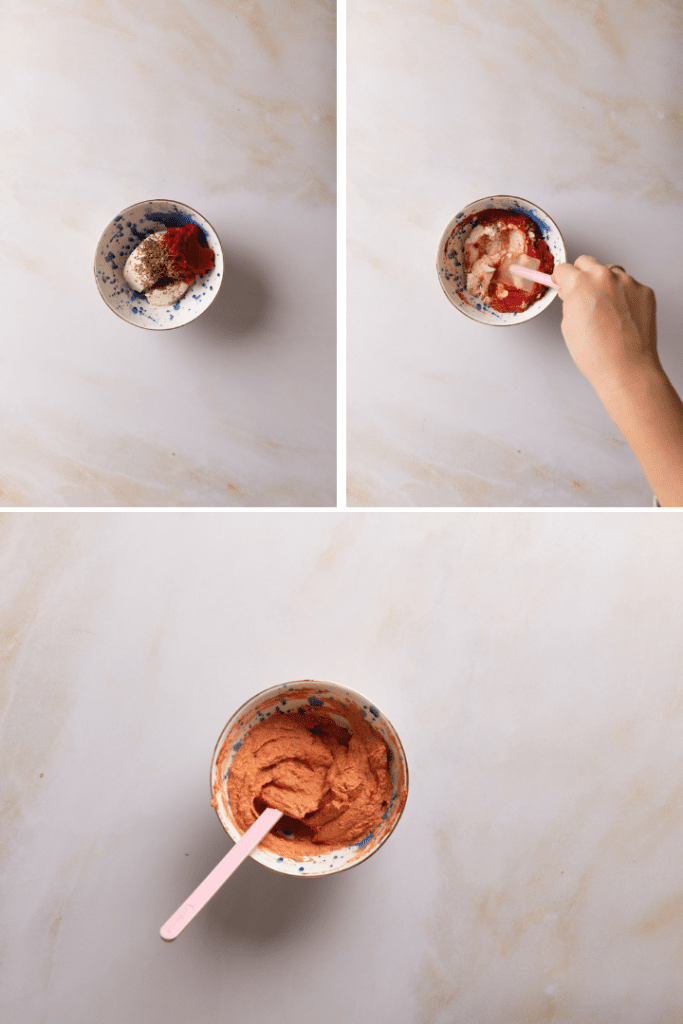 Heize den Backofen auf 170 °C Ober- und Unterhitze vorheizen und ein Backblech mit Backpapier auslegen. Frischkäse, Tomatenmark, Oregano sowie Salz und Pfeffer in eine Schüssel geben und gründlich vermengen.