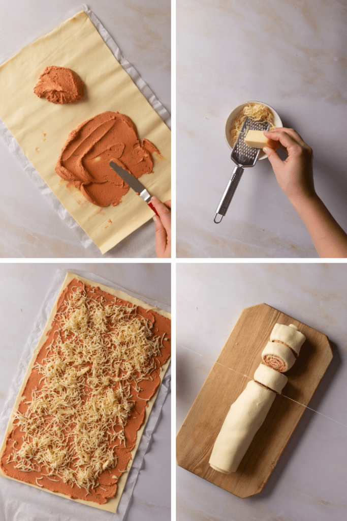 Blätterteig entrollen und mit der Frischkäsemasse bestreichen. Den Gouda reiben und darauf verteilen. Den Blätterteig nun eng aufrollen. Teigrolle in ca. 2 cm dicke Scheiben schneiden. Das funktioniert besonders gut mit der Fadentechnik. Dafür nimmst du ein Stück Bindfaden, legst es an der gewünschten Stelle um den Teig, überkreuze die Fäden und ziehe sie zu. So bekommst du perfekt glatte Blätterteigschnecken.