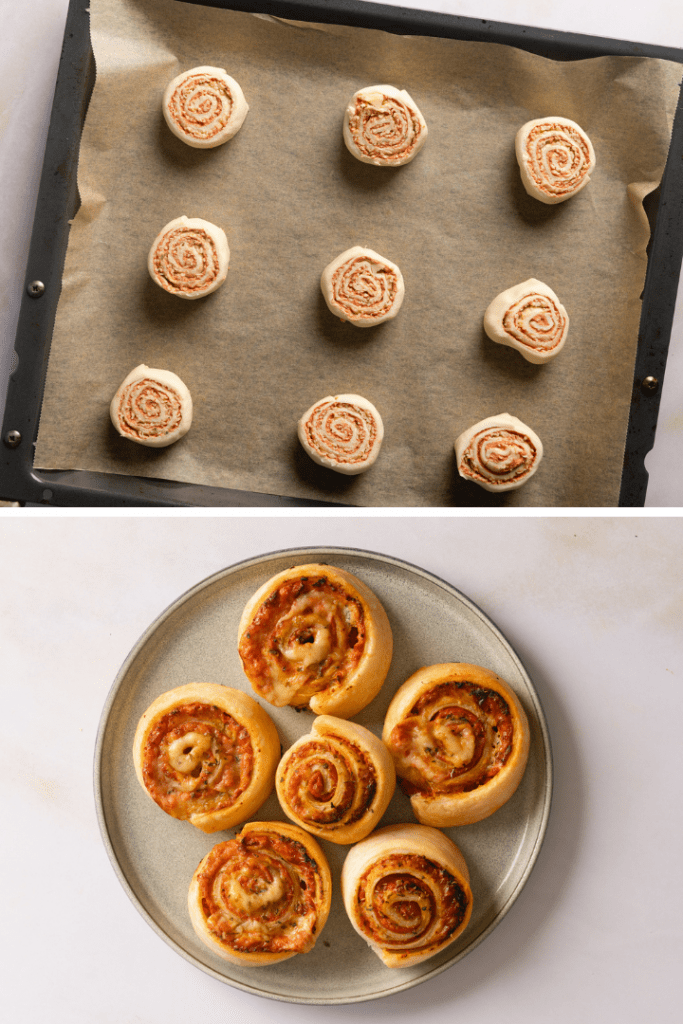 Setze die Pizzaschnecken auf das vorbereitete Backblech und backe sie im vorgeheizten Backofen bei 170 °C Ober- und Unterhitze etwa 20 Minuten bis sie goldbraun sind.
