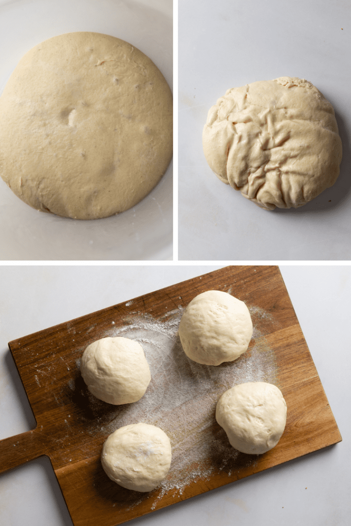 Eine Stunde vor dem Pizza backen den Teig aus dem Kühlschrank nehmen und aus der Schüssel holen. In 4 gleich große Teile aufteilen, jeweils zu einer Kugel formen und auf ein gut bemehltes Brettchen legen. Mit einem sauberen Geschirrtuch zudecken und an einem warmen Ort für etwa 1 Stunde aufgehen lassen. Derweil auch den Backofen auf mindestens 250 °C vorheizen. Wer möchte kann einen Pizzastein oder Pizzastahl zum backen der Pizzas verwenden.