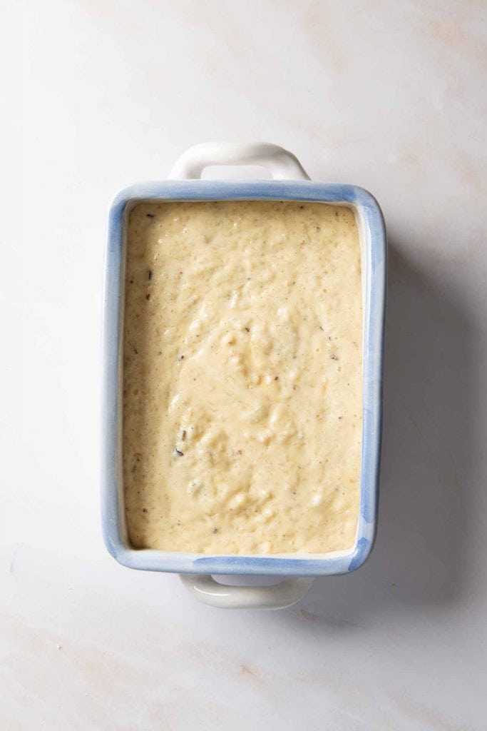 Fülle die Mischung in eine Auflaufform und backe den Reisauflauf im vorgeheizten Backofen ca. 30 Minuten bis er goldbraun ist.