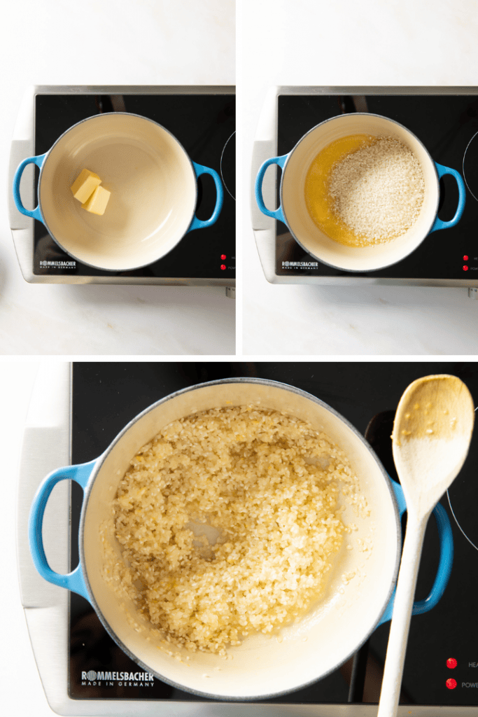 Schmilz die Butter in einem Topf und brate den Reis kurz darin an, bis die Reiskörner glasig werden.