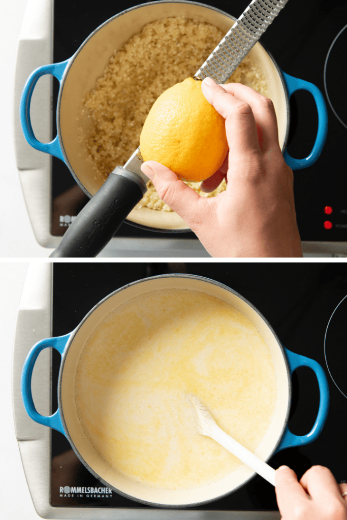 Gieße die Milch auf und gib den Zitronenabrieb dazu. Koche den Milchreis bei kleiner Flamme und geschlossenem Deckel für 30 Minuten.