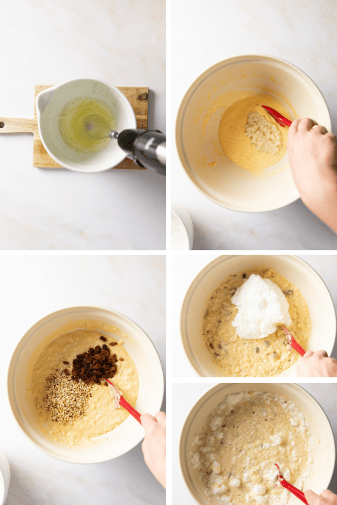 Heize den Backofen auf 170 °C Ober- und Unterhitze vor. Trenne die Eier. Schlage das Eiweiß mit einer Prise Salz steif. Rühre das Eigelb mit dem Zucker cremig. Füge Sultaninen und Nüsse hinzu und hebe den Eischnee unter.