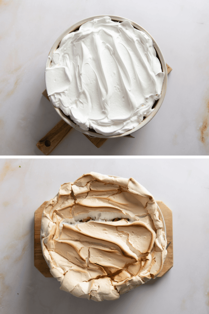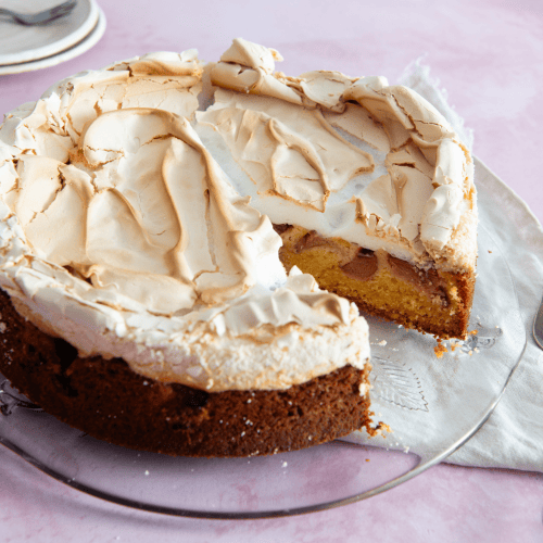 Nach der Backzeit den Eischnee auf dem Kuchen verteilen und nochmals für ca. 15 Minuten backen bis der Eischnee schön golden braun ist. Aus dem Ofen nehmen und nach dem abkühlen servieren.