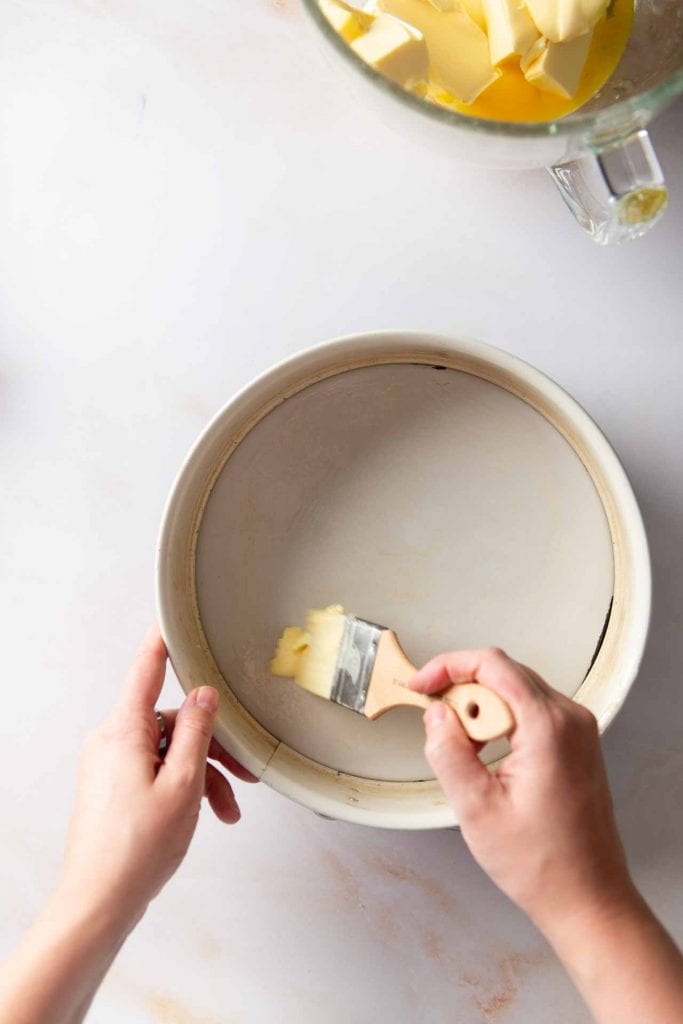 Backofen auf 170 °C Ober- und Unterhitze vorheizen. Backform mit Butter ausstreichen und den Boden der Backform mit Backpapier auslegen.