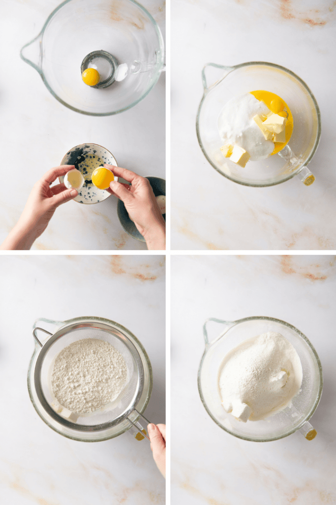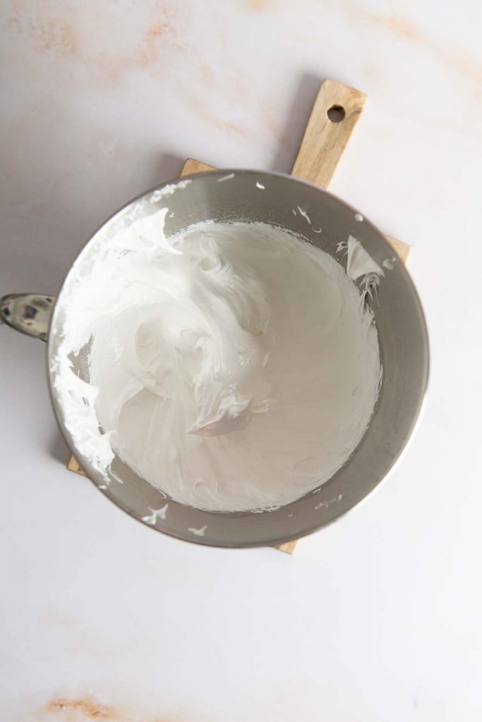 Für den Teig 2 der Eier Trennen. Eiweiß in eine saubere und fettfreie Rührschüssel füllen und zur Seite stellen. Die beiden Eigelb mit dem ganzen Ei, Zucker und Butter in eine Rührschüssel geben. Mehl und Backpulver dazu sieben und das Vanilleextrakt und Salz dazu geben. Alles für ca. 1 Minute zu einem glatten Teig aufschlagen. Teig auf dem Boden der Form gleichmäßig verteilen.