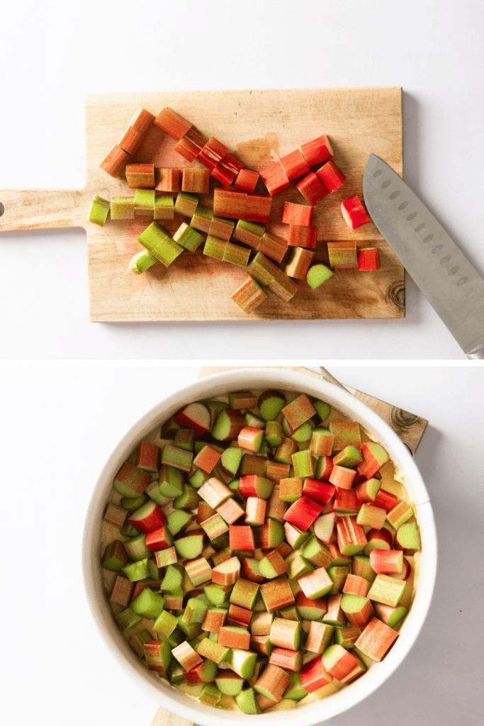 Rhabarber waschen, nach Bedarf schälen und in ca. 1 cm große Stücke schneiden. Auf dem Teig verteilen und alles für ca. 50 Minuten bei 170 °C Ober- und Unterhitze backen.