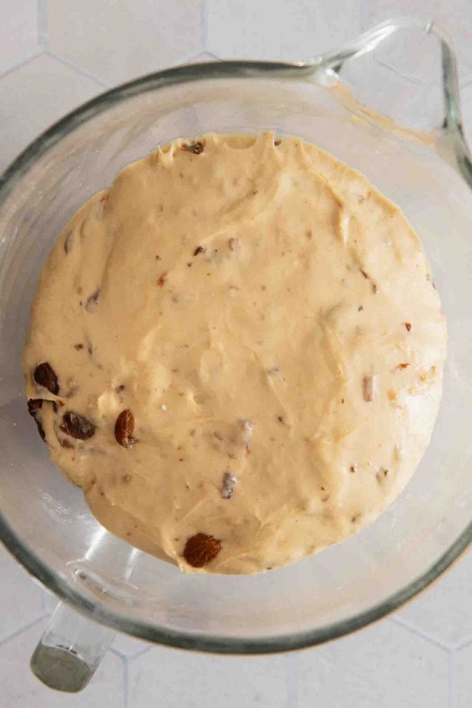 Rosinen abtropfen: Das Einweichwasser der Rosinen gründlich abgießen. Die Rosinen am besten kurz auf einem Stück Küchenpapier abtupfen, damit sie nicht zu nass sind und den Teig wässrig machen.