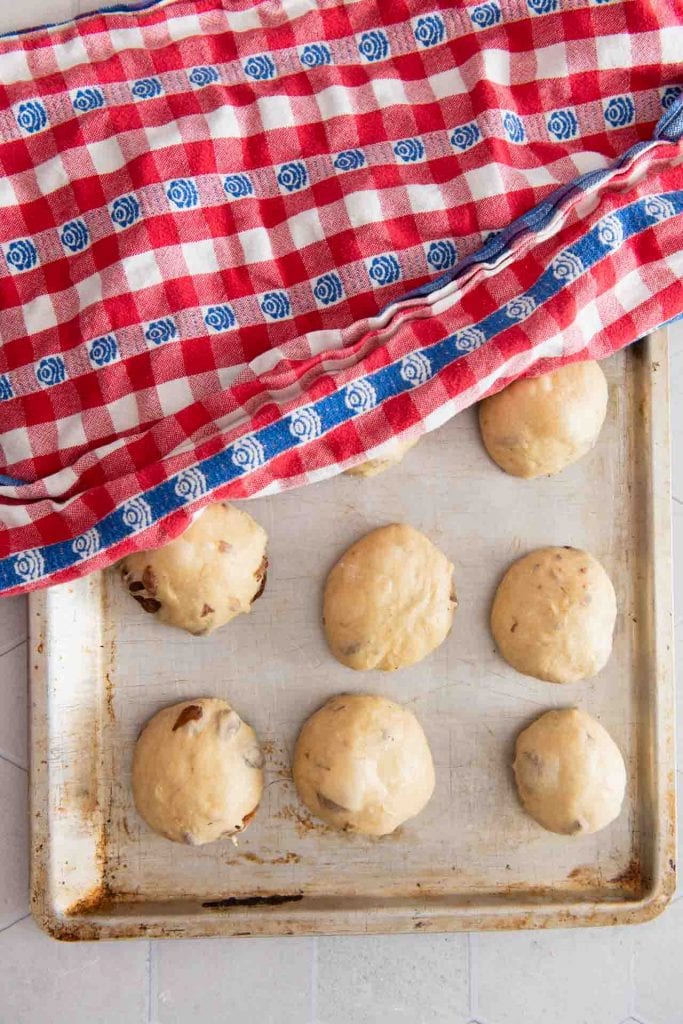 Stückgare (2. Aufgehen): Die Kugeln mit ausreichend Abstand auf ein mit Backpapier belegtes Backblech setzen. Erneut abdecken und für 20 bis 30 Minuten ruhen lassen, bis sie sichtbar fluffiger geworden sind. In der Zwischenzeit den Backofen auf 170 °C Ober- und Unterhitze vorheizen.