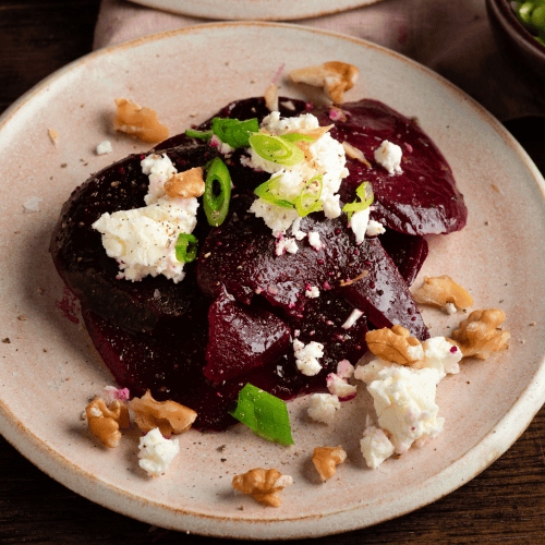 Zum servieren die eingelegten Rote Bete auf einen Teller geben. Feta darüber krümeln, Walnüsse dazugeben und mit Frühlingszwiebeln und frisch gemahlenem Pfeffer garnieren.