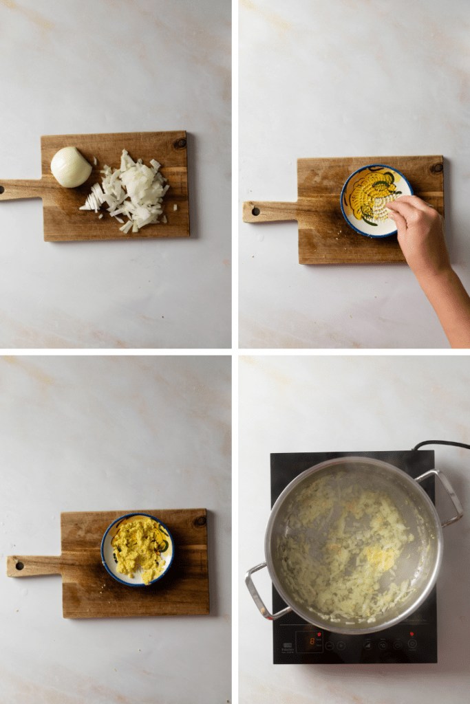 Zwiebel und Knoblauch fein hacken. Ingwer schälen und reiben. In einem mittelgroßen Topf das Kokosöl erwärmen. Zwiebeln, Knoblauch und Ingwer darin glasig dünsten.