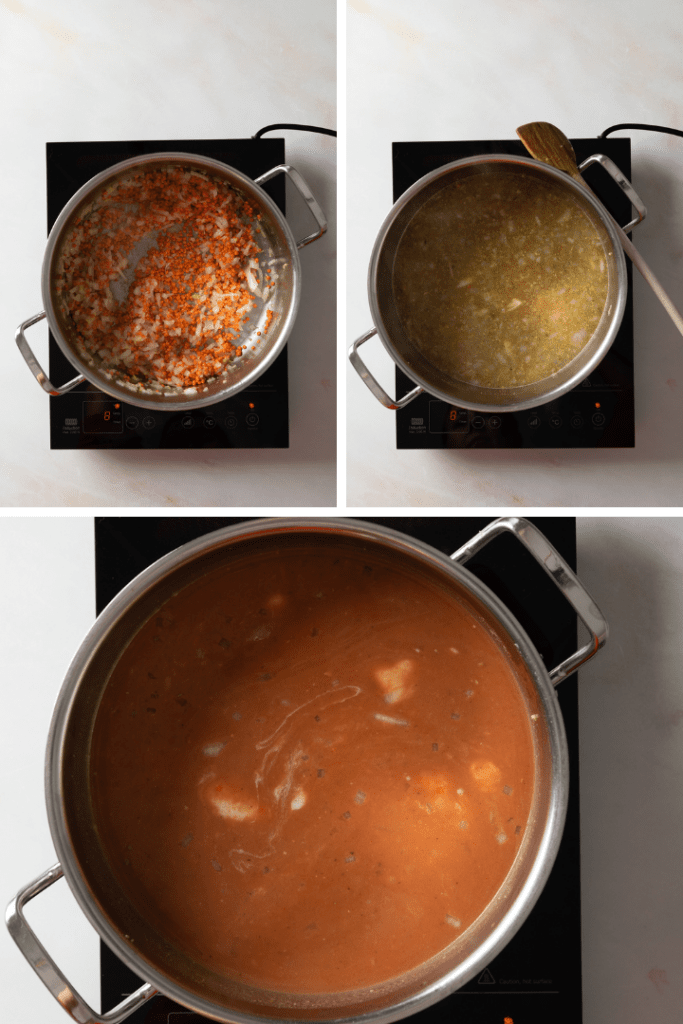 Die roten Linsen sowie Garam Masala in den Topf geben. Etwa 1 Minuten bei ständigem Rühren anbraten. Dann mit Kokosmilch, passierten Tomaten und Gemüsebrühe ablöschen.