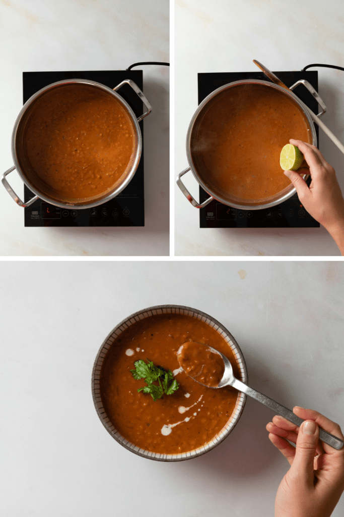 Umrühren und bei geschlossenem Deckel ca. 15 Minuten garen lassen, bis die Linsen zart sind. Mit Limettensaft, Salz und Pfeffer abschmecken.