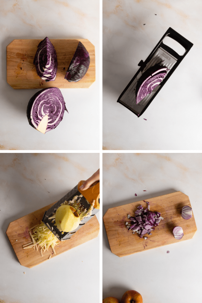 Rotkohl von den äußeren Blättern befreien, vierteln und den Strunk entfernen. Rotkohl dann mit einer Küchenmaschine oder einem Gemüsehobel in Streifen von etwa 2 - 3 mm Dicke hobeln. Äpfel schälen, entkernen und raspeln, Zwiebel fein würfeln.