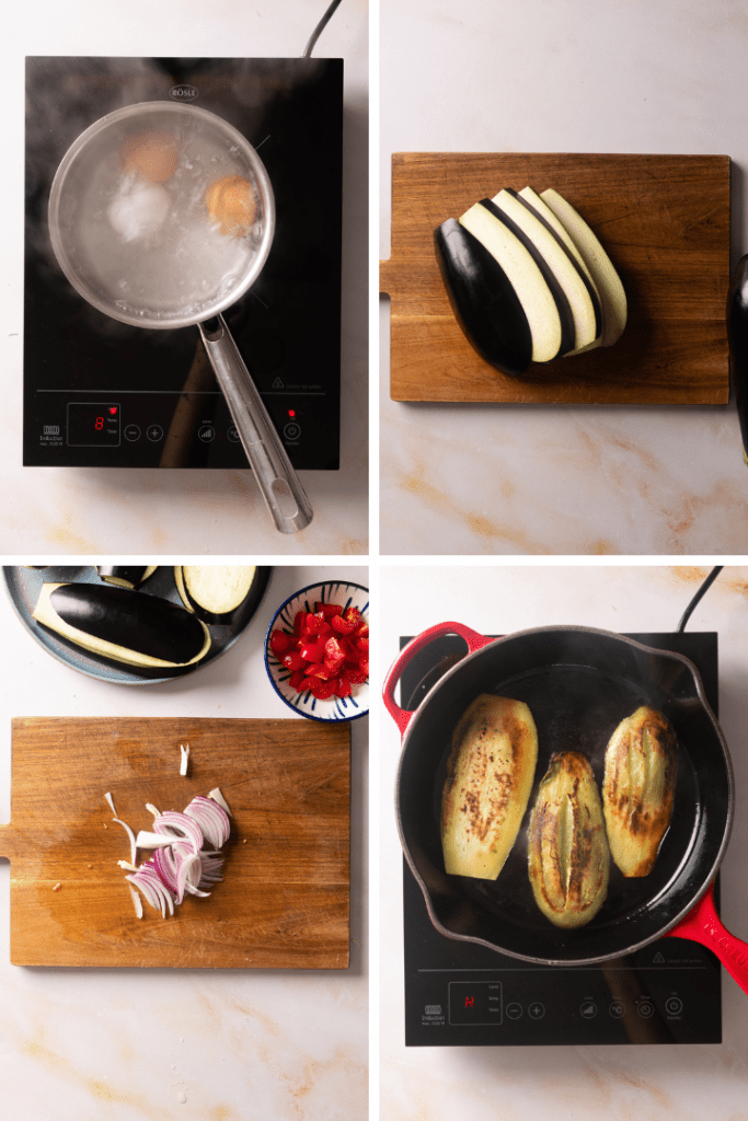 Für den Sabich Wrap zunächst Eier kochen, die Aubergine in Scheiben schneiden. Tomate in Würfeln und Zwiebel in Ringe schneiden. Die Auberginenscheiben in etwas Olivenöl anbraten.